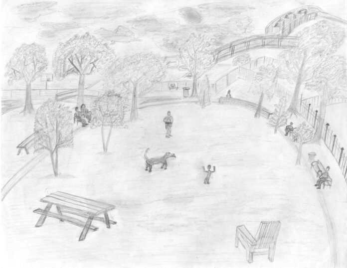 This drawing was inspired by my many visits to the Schuylkill River Park over this last summer. The scene depicts the various activities of people who frequent the park, such as a father playing with his son and their dog, a man playing guitar on the bench, and a man reading his book (the vantage point for the next work, Slice of Life). This work is a panoramic view both literally and figuratively of life, showing both the actual panorama of a park and the panoply of activities that people enjoy at public parks. A major source of inspiration for this work was Maurits Cornelis Escher’s Hand with Reflecting Sphere, which has a fish-eye effect that allows you to see the artist himself and the room around him. Escher’s work juxtaposes vertical and horizontal views in one piece, which creates a surreal quality to it, as in Panorama of Life.