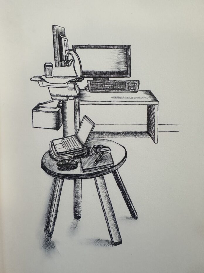 I don’t have a desk — more specifically, there are no desks in the room, just knee-high side tables — but I make it work. I start typing feverishly in a tiny Epic box, flipping between UpToDate tabs and walking down Penn Pathways, incorporating everything that is objective and good and true into my humble progress note. I hunch, creating a world of back problems for myself 30 years down the line, and lean further still into this note. I look it over, and then I check it again, and then one more time. Pertinent labs and results: recorded and interpreted. All active problems: addressed and accounted for. Subjective: illustrated, beautifully. I hit “pend,” take a swig of meal replacement, and then chase it down with some unfortunate coffee. Time for rounds.